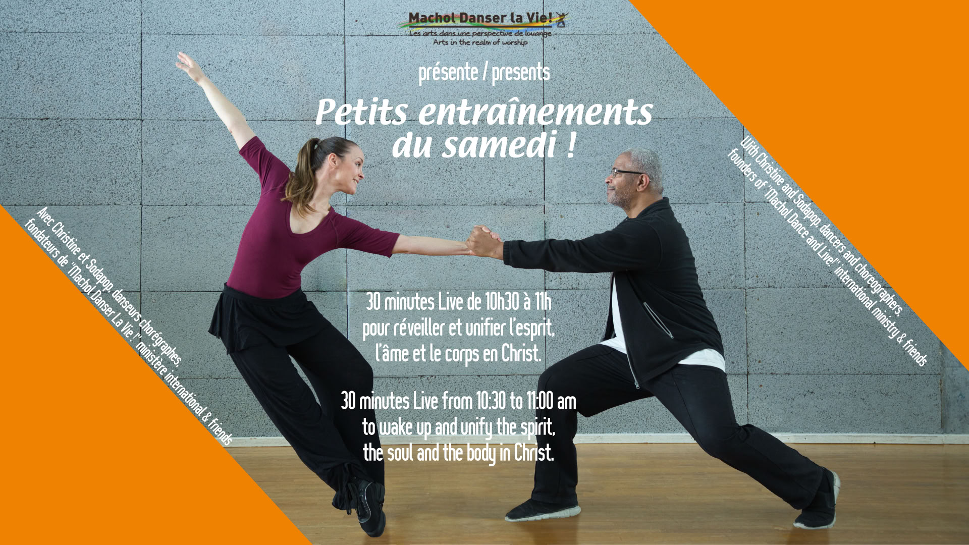 En réponse à vos demandes, nous sommes heureux d’avoir lancés les "Petits entraînements du samedi !" en LIVE sur notre chaîne YouTube, depuis le 17 avril 2021 pour, ensemble, célébrer la Vie et être nourri de la Sève éternelle de Christ, dans notre esprit, notre âme et notre corps.